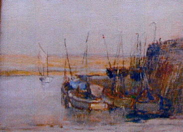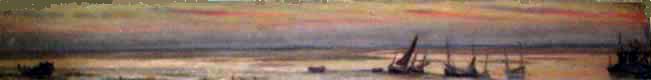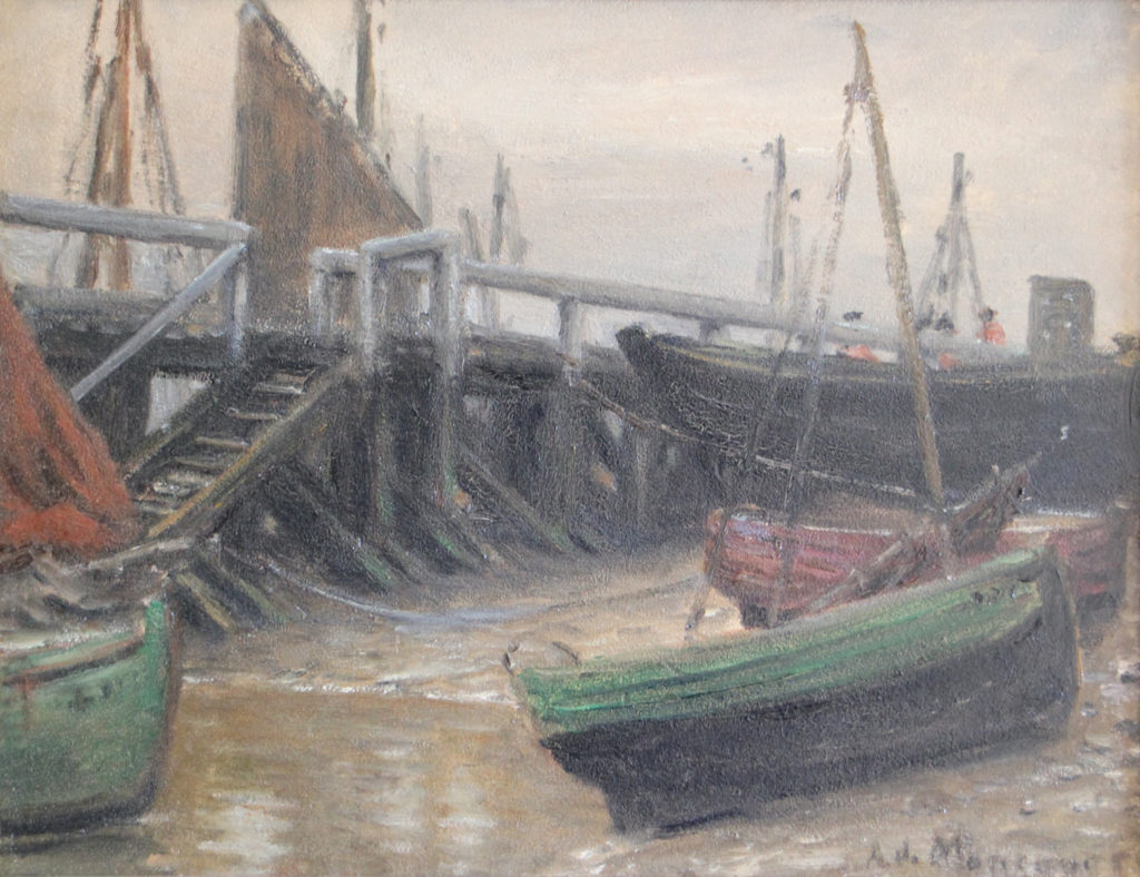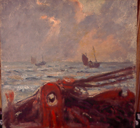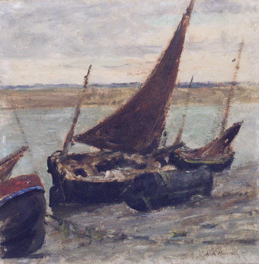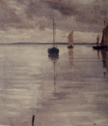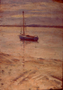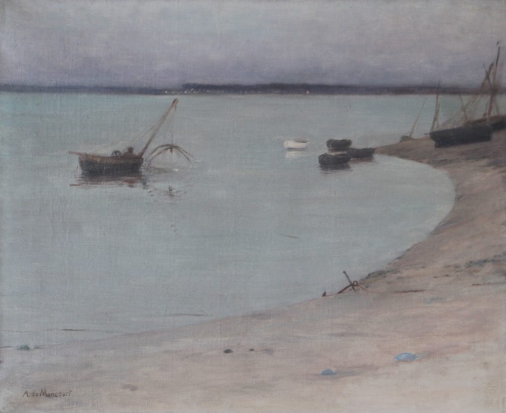 Plusieurs petits bateaux semblent attendre la marée montante pour pouvoir partir mer ou accéder aux ports de pêche. L’horizon se partage entre la baie avec son activité de pêche et le ciel chargé de nuages animés par des reflets rosés du soleil couchant.