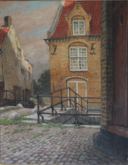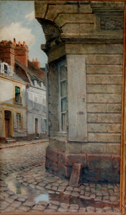 Le motif principal de cette œuvre tardive présentée au salon de 1927 et 1930 est encore visible aujourd’hui puisqu’il s’agit de l’élégante demeure du XVIIIe siècle située à l’angle de la rue des Rapporteurs et des Poulies (actuel N°1) : la masse de pierre située ici à contre-jour se découpe sur plus de la moitié de l’espace de la toile, la fenêtre inscrite dans le pan coupé, aujourd’hui disparu, marquant le centre de la composition. L’ensemble est admirablement porté par l’art d’Albert Siffait de Moncourt, dessinant là dans une flaque un paysage inversé, dorant d’ailleurs le pavé, célébrant ici le matériau par un travail fouillé du mur solidement parementé, dont il souligne de rehauts lumineux les arêtes.